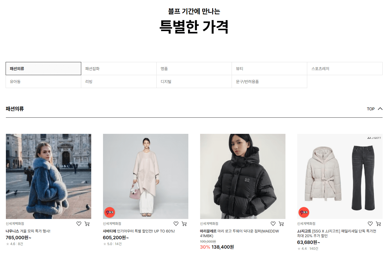 - 명품 및 잡화: 몽클레르, 어그(UGG) 등 인기 명품 브랜드의 가방, 신발, 액세서리를 최대 50% 할인된 가격에 만나볼 수 있습니다.